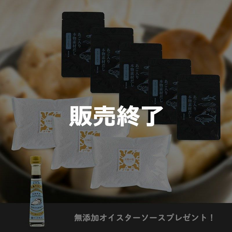 あご入り本物素材だしと太陽の塩。