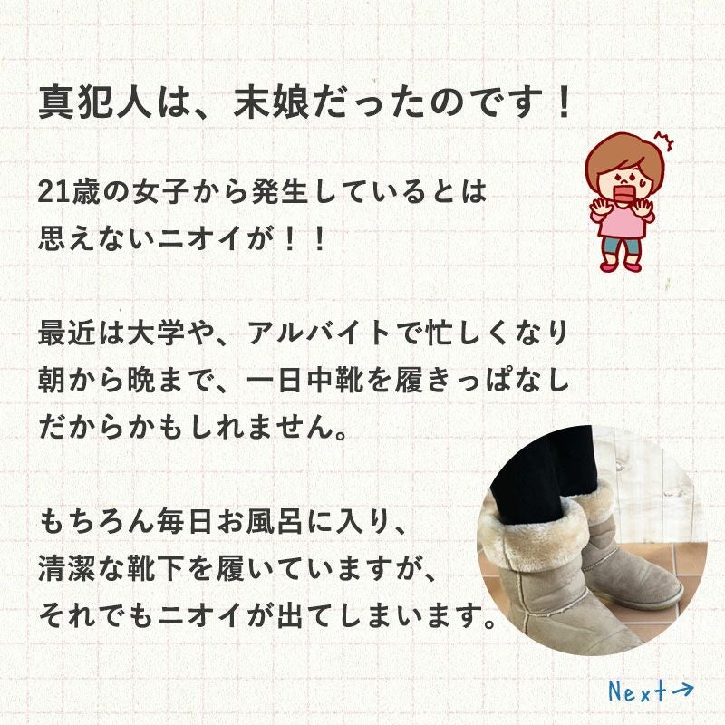 家族が学校や仕事に行く前に、靴の中に1~2回(0.5cc~1CC)振るだけで準備おしまい!