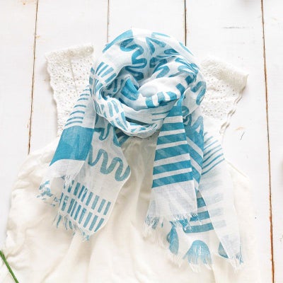 爽やかな色と北欧風のデザイン、そして何より柔らかいのに張りのある生地に満足です。外出先でもかさばらないので冷房対策として常備すると安心です。